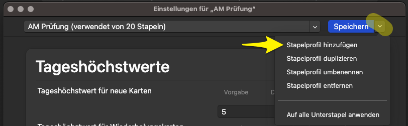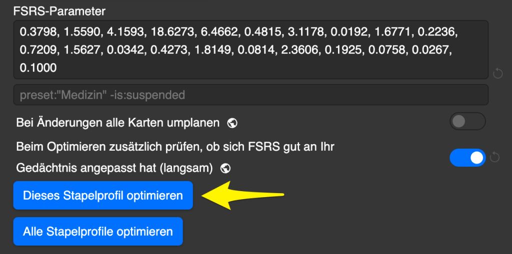 2. Dieses Stapelprofil optimieren: wenn gedrückt, nimmt es alle Wiederholungen der Stapel, die dieses Stapelprofil (zum Beispiel AM Prüfung) verwenden – und optimiert anhand dieser Wiederholungen (deiner bisherigen) die FSRS-Parameter (gelber Pfeil). Bei mir waren es in ca. 2 Monaten 2077 Wiederholungen. Dies beeinflusst (optimiert), wann du Karten in der Zukunft wieder siehst. Danach oben rechts auf Speichern drücken.