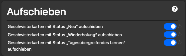2. Ansonsten alle drei einschalten: damit ähnliche Karten (z. B. {{c1::…}}, {{c2::…}} etc., also die aus einer Notiz entstandenen Karten) nicht nah beieinander gezeigt werden.
