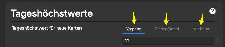1. Tageshöchstwerte für neue Karten: in allen 3 Tabs (gelbe Pfeile) sollte die gleiche Anzahl stehen.