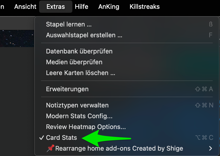 Lässt dich optional die ausführlichen Statistiken jeder einzelnen Karte während des Wiederholens anzeigen. Dafür unter „Extras“ „Card Stats“ (grüner Pfeil) einschalten.