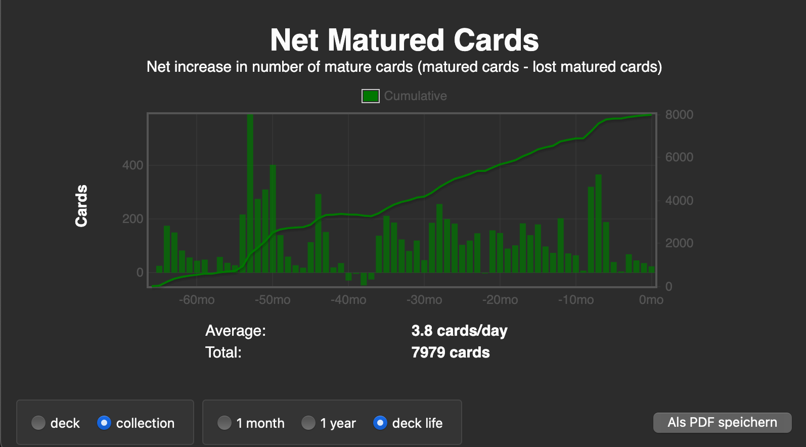 Am unteren Rand des Fensters kannst du einstellen, ob dies für einen Stapel („deck“) oder die gesamte Sammlung („collection“) angezeigt werden. Und für welchen Zeitraum es angezeigt werden soll.