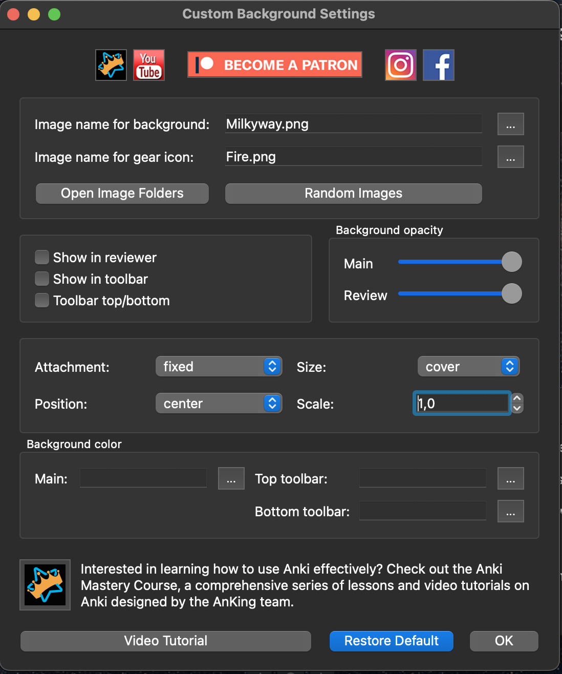 Erlaubt den Startbildschirm und / oder den Bildschirm während der Wiederholungen mit einem Hintergrundbild zu versehen. Nach der Installation Anki 1x Neustarten, dann erscheint in der oberen Leiste „AnKing“. Da drauf klicken und „Customize Background and Gear Icon“ (grüner Pfeil) wählen. Es erscheint ein neues Fenster, über welches ihr das Hintergrundbild / Symbol für die Zahnräder neben den Stapeln und Hintergrundfarbe auswählen könnt. Es gibt einige vorinstallierte Bilder, ihr könntet aber auch eure eigenen hinzufügen.