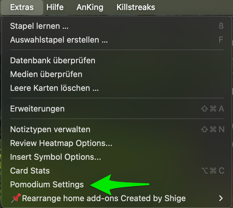 Mit Klick auf „Extras“ → „Pomodium Settings“ (grüner Pfeil) kann u. a. Die Timer Länge eingestellt werden.