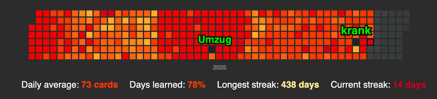 Lässt dich Medaillen sammeln, wenn du mehrere Karten hintereinander mit „Gut“ beantwortest. Damit wirst du für Serien richtig beantworteter Karten belohnt. Die Medaillen entstammen sog. „Shootern“, was ihren Nutzen aber nicht schmälert. Natürlich darf es nicht dazu führen, dass du unehrlich wirst und Karten zu gut bewertest! Das würde deinen Lernerfolg stark reduzieren.
