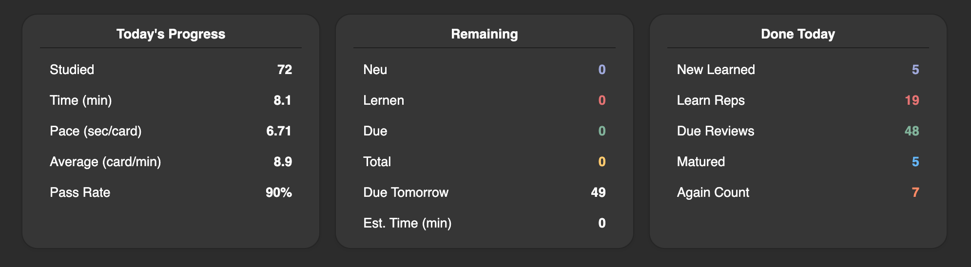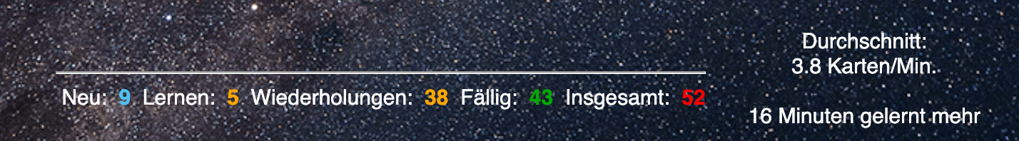 Stellt bereits gesehene Karten für einen Stapel und die gesamte Sammlung für den heutigen Lerntag visuell da. Damit erhältst du pos. Feedback fürs Lernen und eine kleine visuelle Belohnung.