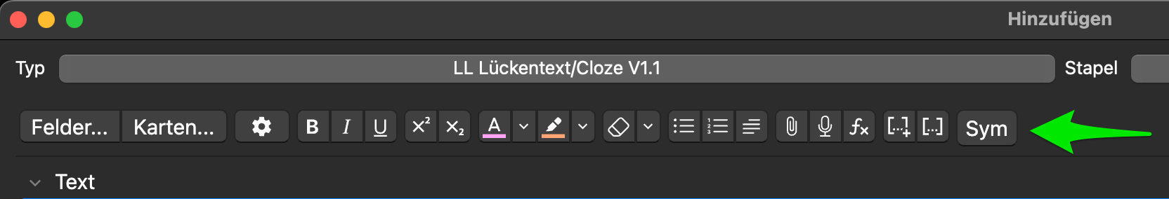 Fügt im „Karten-Hinzufügen-Fenster“ (Shortcut A) einen Button ein, der schnell Pfeile, griechische Buchstaben, mathematische Formeln u. v. m. einfügt. Direkt klickbar (grüner Pfeil) oder per Shortcut Strg + S Apple: Cmd + S.
