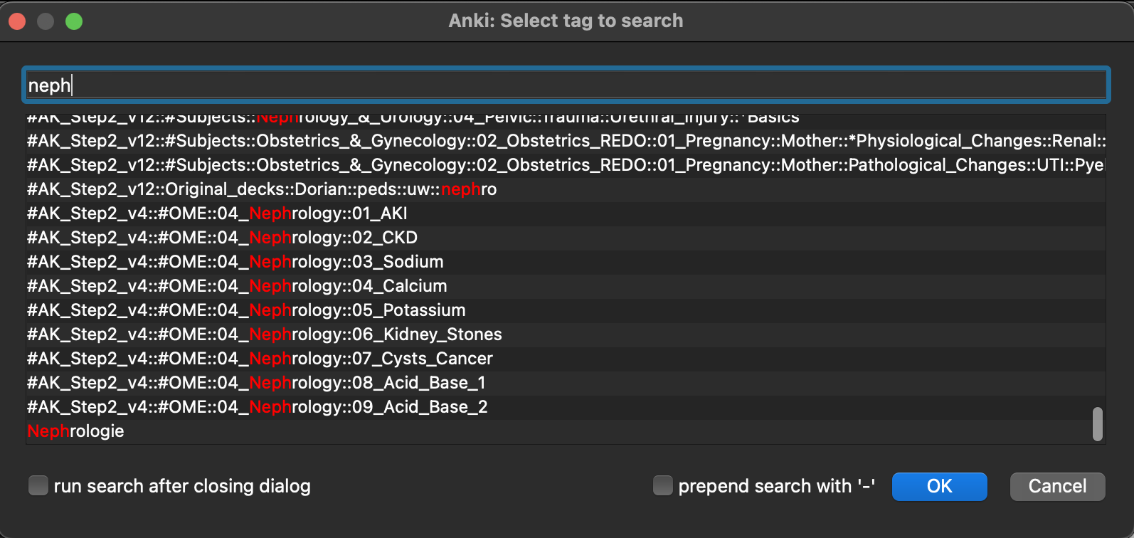 Elegante Verbesserung der Suche in der „Kartenverwaltung“ (Shortcut B). Wenn du tag:(Schlagwort), deck:(Stapel), note:(Notiz), card:(Karte), flag: (Flagge) in das Suchfeld unter „Kartenverwaltung“ (Shortcut B) eingibst, öffnet sich automatisch ein weiteres Feld, dass dir sofort deine Schlagwörter etc. anzeigt. Wenn du dann die ersten beiden Buchstaben eingibst (zum Beispiel tag:me), zeigt dir die Suche sofort deinen „Medizin“-Tag an.